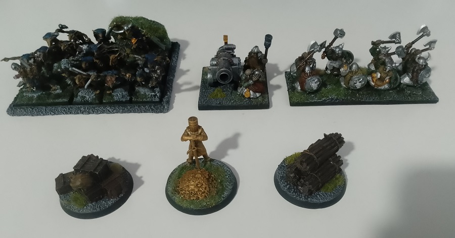 ¡Puedo decir con alegría que conseguí cumplir el reto! Añado además, siendo sincero, que soy el primer sorprendido por ello. A continuación podéis ver la foto de familia con lo pintado este mes de noviembre. Se trata de un regimiento de gnoblars (dieciséis miniaturas, aunque ocupan como si fueran veinte gracias a dos rellenadores), una tropa de ocho enanos, un cañón con dotación (tres miniaturas) y, para lograr cumplir el reto en un mes en el que he pasado unos días fuera de casa, tres marcadores de objetivo para la cuarta edición de Kings of War, de salida inminente.