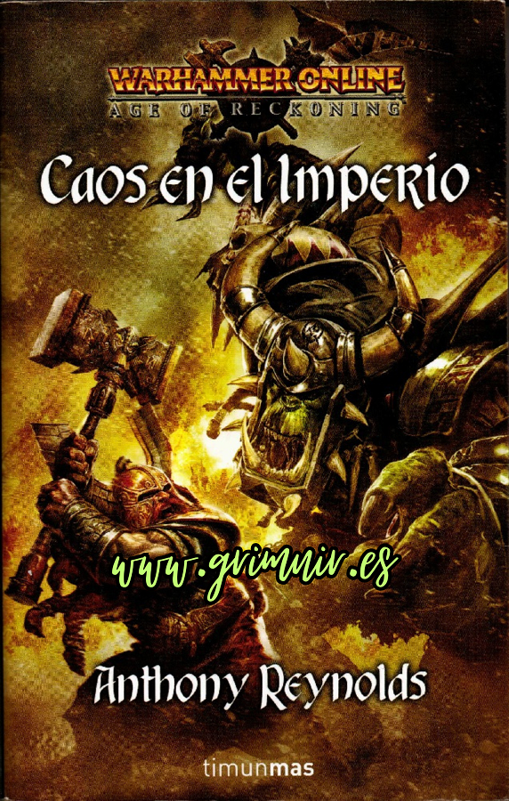 La novela que voy a reseñar aquí, Caos en el Imperio, fue la primera de una trilogía publicada precisamente bajo el título Age of Reckoning, libros que beben directamente del videojuego. Los otros dos títulos publicados en esta trilogía, nunca editados en español, son Dark storm gathering y Forged by Chaos. Fueron publicadas en diciembre del 2008, febrero del 2009 y febrero del 2010 respectivamente, aunque la única que fue editada en español, Caos en el Imperio, lo hizo en septiembre del 2009. Las dos primeras novelas cuentan con un argumento muy similar: para detener a las fuerzas del mal, cuatro héroes muy distintos deben unirse. La peculiaridad es que la primera se centra en El Imperio (con aparición de los enanos) y el enemigo son el Caos y los orcos y goblins, mientras que en la segunda gira sobre todo en torno al conflicto entre altos elfos y elfos oscuros, completando así los seis pueblos (tres del bien y tres del mal) en que se centraba el videojuego. La tercera, para variar, se centra más en la facción del Caos, y es protagonizada por un bárbaro. Otra cuestión a tener en cuenta es que los propios personajes son razas y clases jugables en Age of Reckoning. En Caos en el Imperio, por ejemplo, los cuatro héroes son un rompehierros enano, un cazador de brujas humano, una sacerdotisa humana y un sombrío alto elfo, que son cuatro de las doce opciones disponibles en el videojuego para personajes en el lado del bien.